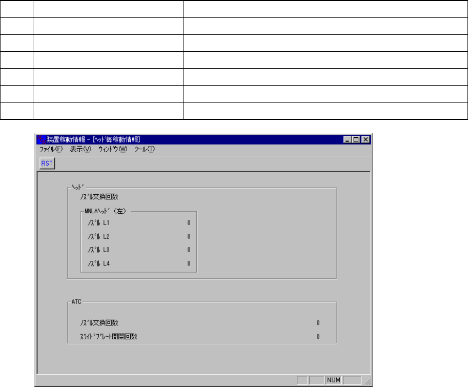 9 - 13 9-4-3. ヘッド ヘッド ヘッド ヘッド毎 毎 毎 毎稼動情報 稼動情報 稼動情報 稼動情報 9-4-3-1. ヘッド毎稼動情報 ヘッド毎稼動情報 ヘッド毎稼動情報 ヘッド毎稼動情報 メニューバーの [ ウィンドウ( W )→ ヘッド毎稼動情報 ] を選択すると、図 9-4-3-1 が表示さます。 NO NO NO NO 内容 内容 内容 内容 1 ノズル交換回数(ノズルL1) ノズルL1のノズル交換回数の累計…