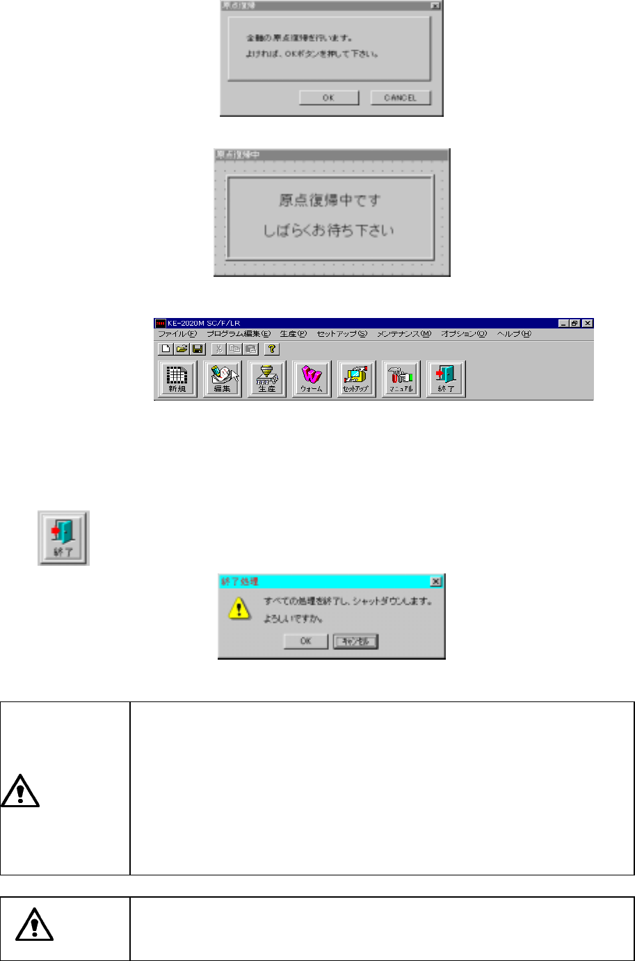 3 - 13 暫くして, 初 期化が終了し ますと, 原点復帰画面が表示されま す。 ここで, 原点復帰を行 わない場合には, <CANCEL> ボタン を押下し て下さい。 また, 原点復帰が完了す ると, メインメ ニュー画面 が表示されま す。 図 図 図 図 3-4- 2 原点復帰ダイアログ 原点復帰ダイアログ 原点復帰ダイアログ 原点復帰ダイアログ 図 図 図 図 3-4- 3 原点復帰完了待ちダイアログ 原点…
