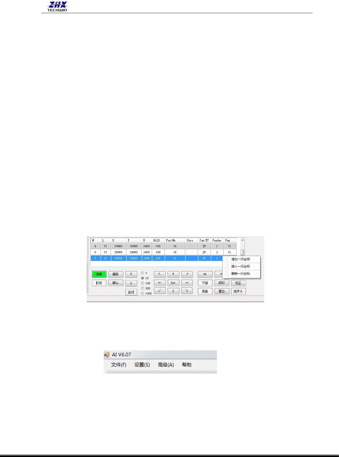 ZHX-A30C& D-AS(I N) 自动卧式联 体插件机操作 说明书 深圳市中禾 旭精密机械有 限公司 http:// www .z kdip.com - 12 - 偏移: 当对 程序的“OS”后面 一行进行 X、Y 的编辑修改时此键 会变为绿色 ,修改完毕 并且在 退出编辑前 如果单击它, 那么该程序的 其它所有行的 X、Y 坐标都自动按第三 行的修改 量偏移。如 果修改完毕在 退出编辑后单 击它“偏移”是无 效的。 确认…