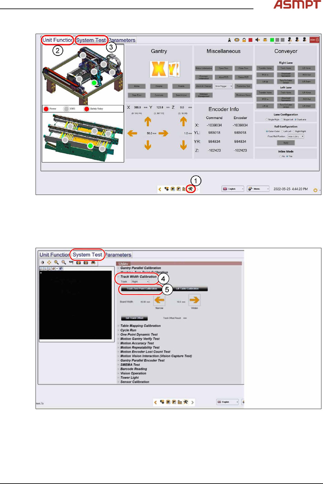 3 Replacing spare parts Se rv ic e Ma nu al P ro ce ss L en s PL - 0 3/ 20 25 79 Procedure Fig.104: “Unit Function” tab and “System Test” tab ► Click on this icon (1) to enter the settings menu. ► Click on Unit Functio…