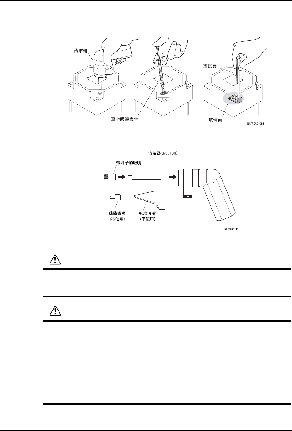 6. 预防保养 QD145-04 162 NXT Ⅱ机械手册 3. 请用安装有清洁纸的擦拭器,小心地将玻 璃表面上粘附的污垢擦去。 备注 )清洁纸的安装方法请参考 " 6.4.3 元件相机玻璃盖罩的清扫 " 一节。 注意 )请在清洁器上安装附属的「带刷子的吸嘴」 。 如果安装缝隙吸嘴和标准吸嘴进行操作, 有可能划伤玻璃,请不要使用。 6.4.5 模组内部的清扫 警告 模组刚运转后,请不要直接触摸 线性马达的轴和线圈部…