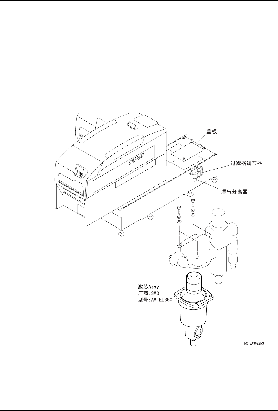 QD145-04 6. 预防保养 NXT Ⅱ机械手册 201 6.9 每 12000 小时的操作 6.9.1 湿气分离器的清扫 1. 拉 出模组。 (参考 " 5.1 模组的拉出 / 插入 ") 2. 请将主电源开关 OFF。 3. 取下基座上的盖板。 4. 关闭气源接入处的外部气源,此时配管 内气压降低。 5. 拧松安装螺栓,拆下滤芯 Assy。 6. 使用压缩空气吹气清扫滤芯,污垢严重 时,请更换新的部品。