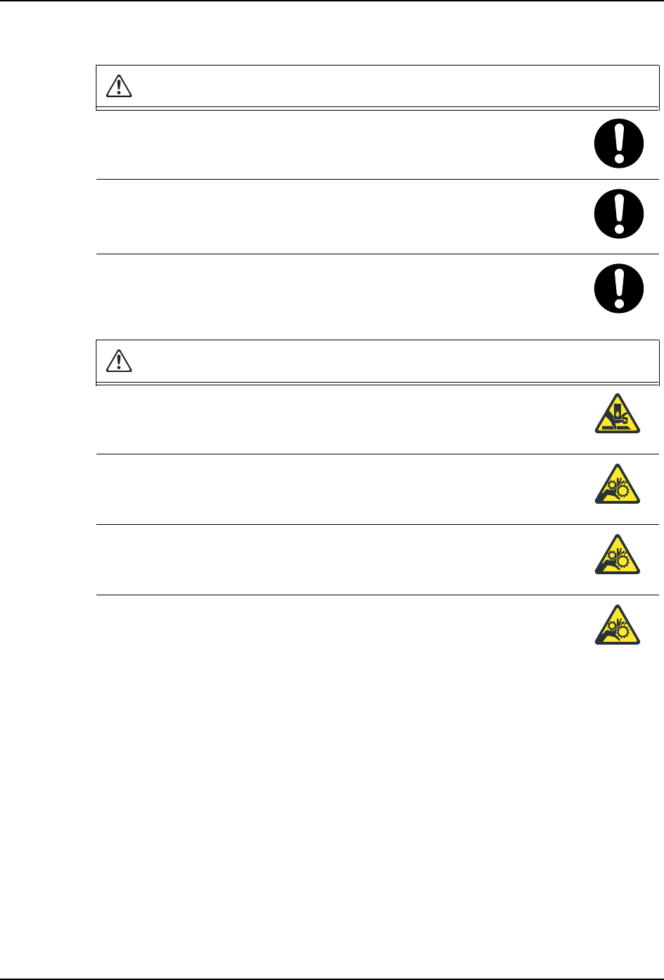 QD145-04 1. 安全指南 NXT Ⅱ机械手册 9 1.3.2 料盘单元 -L 在将料盘单元 -L 安装到机器本体上时,请确认在料盘 单元 -L 与机器本体之 间没有他人。 · 手或者身体有可能被卷入机器而受 伤。 当料盘单元 -L 处于与机器本体分离的状态时,请锁住 脚轮。 · 在不同的地面状态下,被取下的料 盘单元 -L 有可能滑出、与人体相撞导致 人员受伤。 在打开或者关闭料盘单元 -L 的门时,请注意不要被挟 到手指。不要…