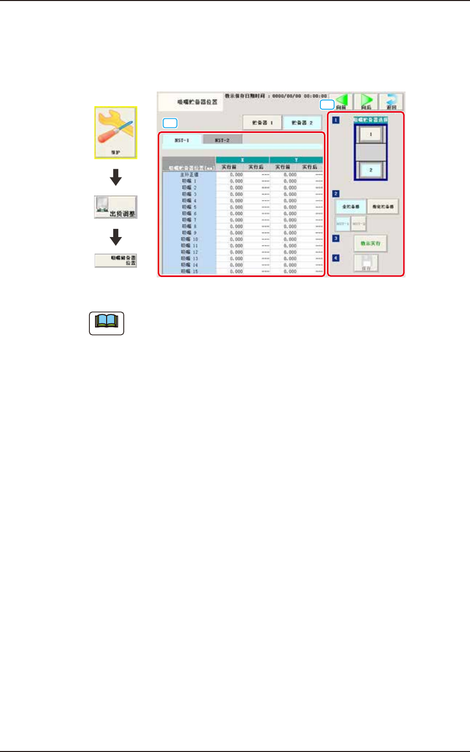 193-3100 CUKYX 5.13 吸嘴贮备器位置 1-55 5.13 吸嘴贮备器位置 为保持吸嘴贮备器的位置 ( 装置坐标基准 ),在“吸嘴贮备器位置”界面中 对吸嘴贮备器的位置补正值进行教示。 界面展开 [1] [2] F3141-CUKYX-00 要 点 界面的显示内容根据加装的吸嘴贮备器 ( 选配 ) 的数量不同会有所不同。 [1] 教示数据显示部 显示指定的贮备器的教示数据。 [2] 教示步骤显示部 按操作顺序排列…