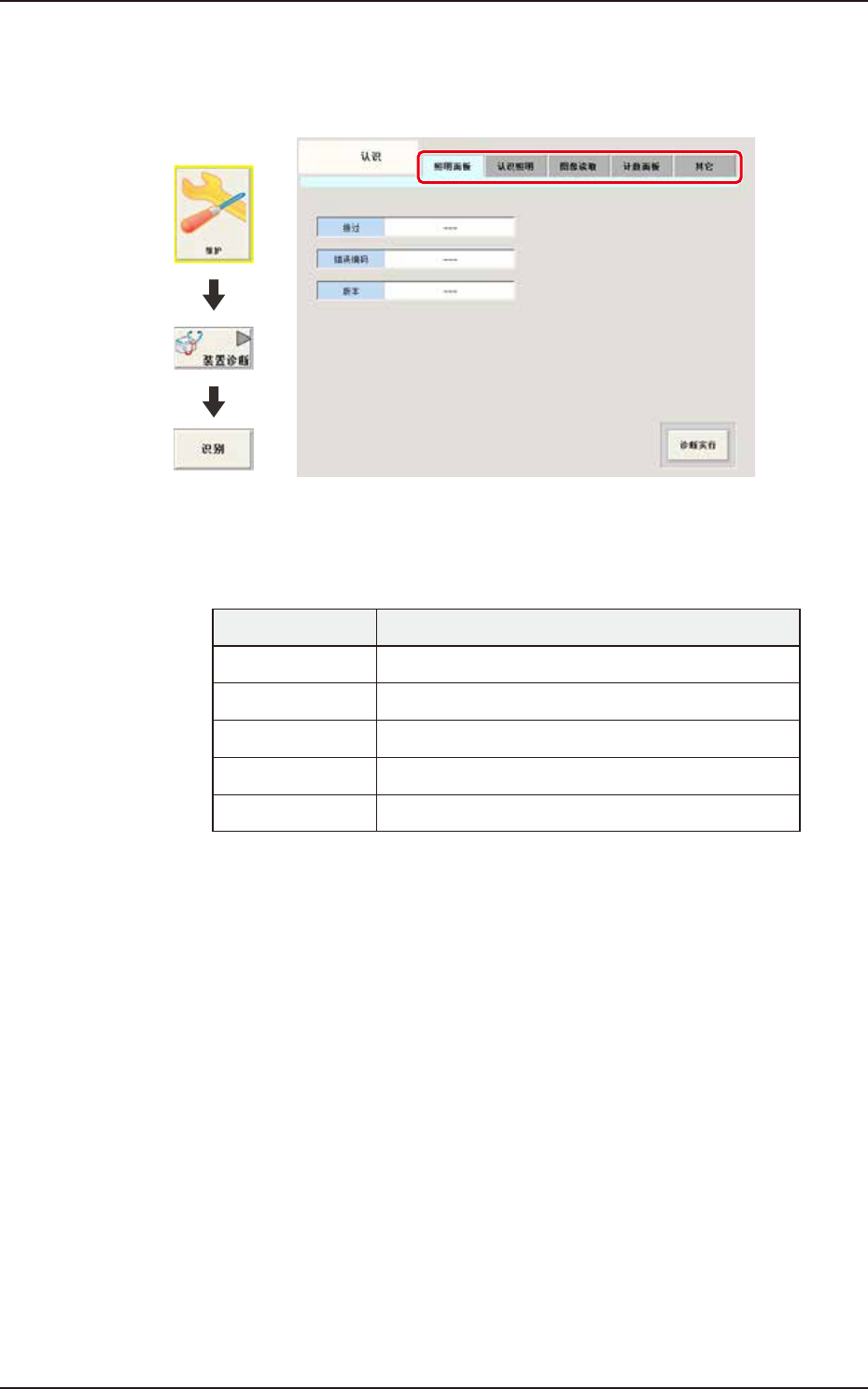 193-3100 CUKYX 6.3 识别 1-89 6. 3. 1 照明板 卡 在“认识 ( 识别 )”界面, 选择“照明面板 ( 板卡 )”选项卡, 显示如下页面。 在本页面中可以对照明板卡进行诊断。 界面展开 [1] [2] [3] [4] F3171-CUKYX-00 [1] 接过 ( 结果 ) 显示照明板卡的诊断结果。 [2] 错误编码 显示照明板卡的错误编码。 [3] 版本 进行诊断之后,若正常,显示照明控制板卡固件的版本。…
