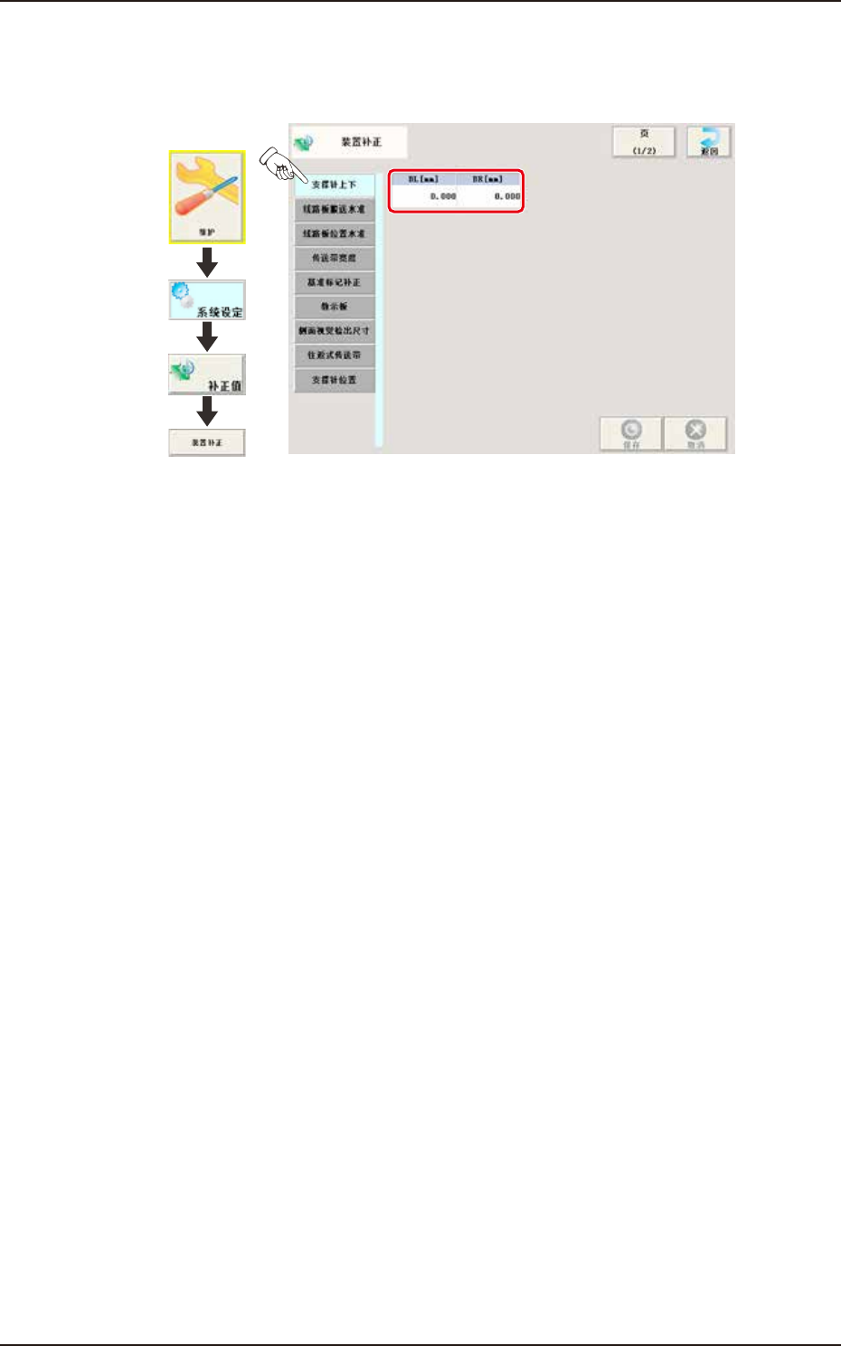 193-3100 CUKYX 2.1 装置补正 2-5 2.1.2 线路板搬送水准 在“装置补正”界面中选择“线路板搬送水准”选项卡,显示如下页面。 界面展开 F3204-CUKYX-00 BL1[mm]、BL2[mm]、BR1[mm]、BR2[mm] 本值是为补正对支撑针上下移动时线路板搬送位置定位偏离用的数据。