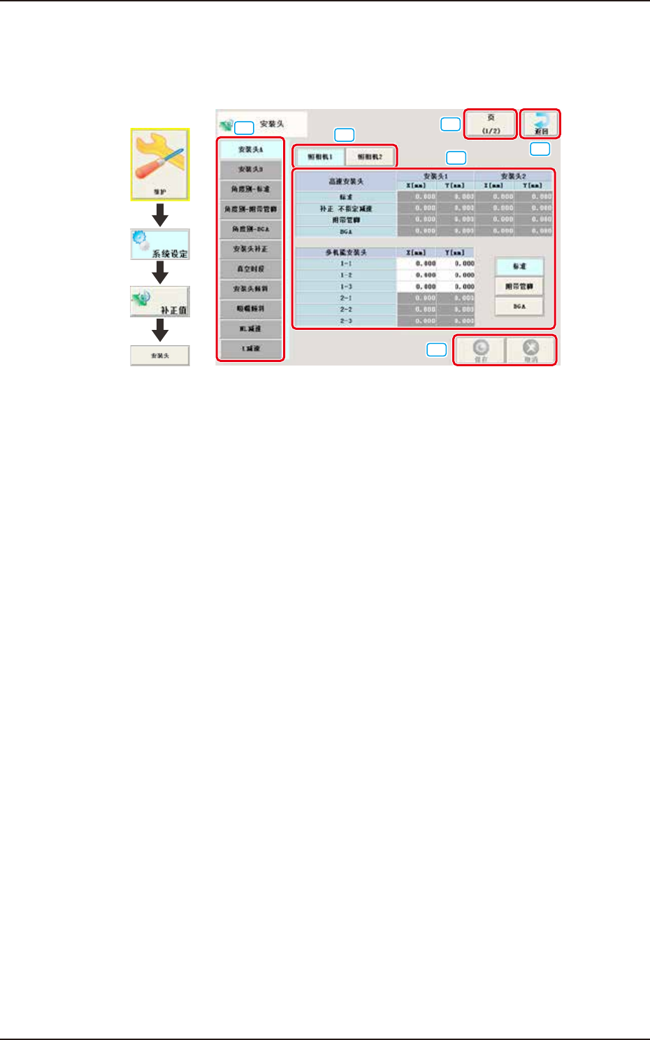 193-3100 CUKYX 2.5 安装头 2-27 2.5 安装头 在“补正数据”界面按 [ 安装头 ] 按钮,显示如下界面。 界面展开 [1] [2] [3] [4] [5] [6] F3231-CUKYX-00 [1] 补正值选项卡 显示选中的选项卡页面的补正值数据。 [2] 补正值数据显示部 显示在 [1] 中选中的补正值数据。 [3] 翻页按钮 翻动补正值编辑界面的页面。 [4] [ 返回 ] 按钮 返回到“补正数据”界面。…