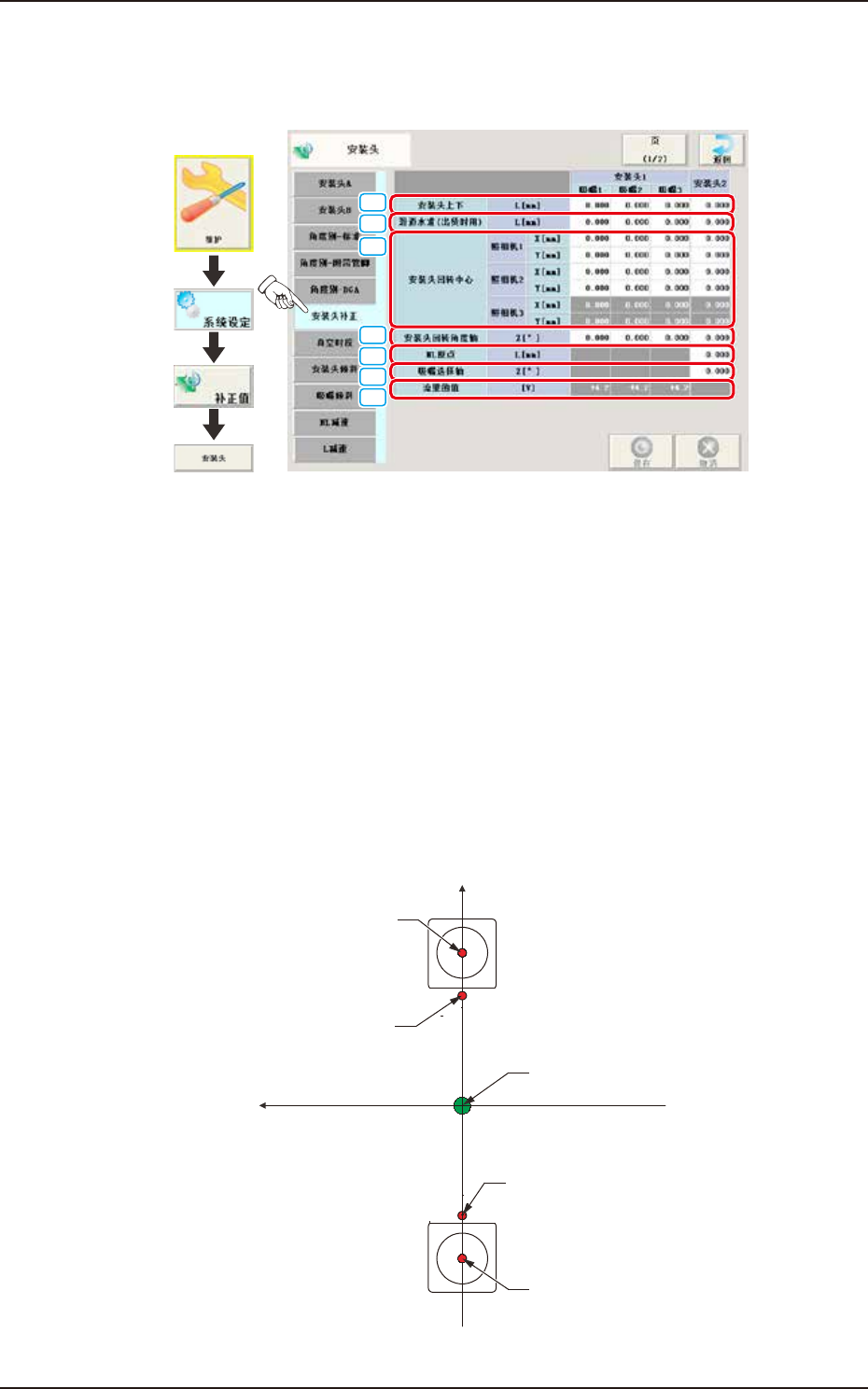 调整安装头旋转中心与线路板识别相机中心相对于设计值的偏移。