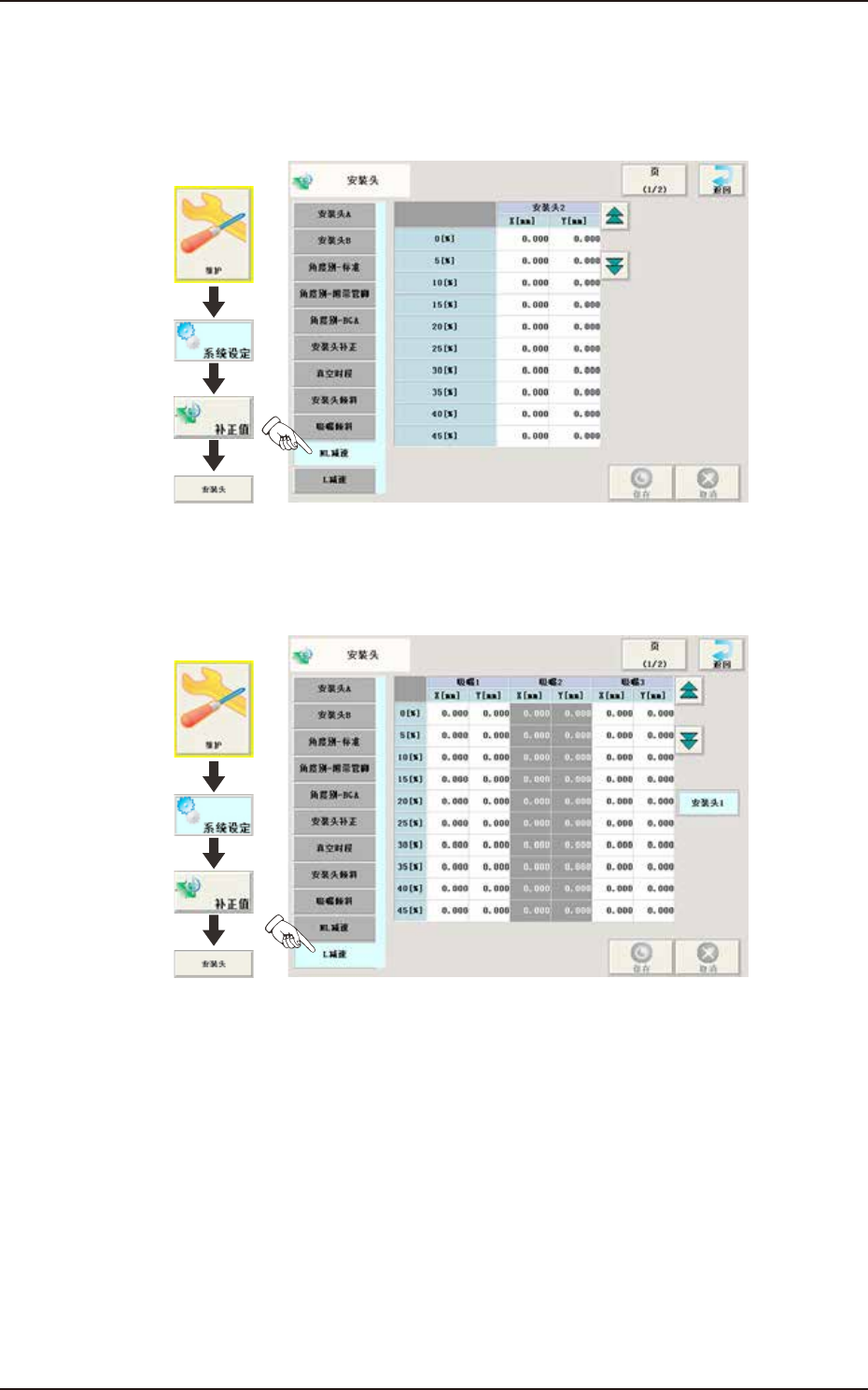 择该选项卡,显示如下页面。对 L 轴减速时所发生的 X、Y 偏移进行补正。