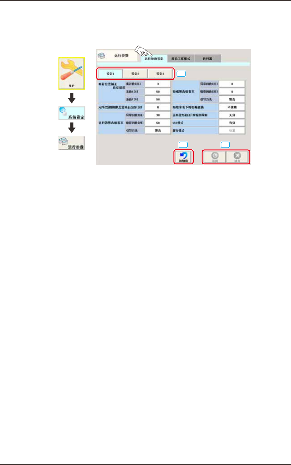 [ 设定 1]、[ 设定 2]、[ 设定 3] 按钮,切换设定页面。
