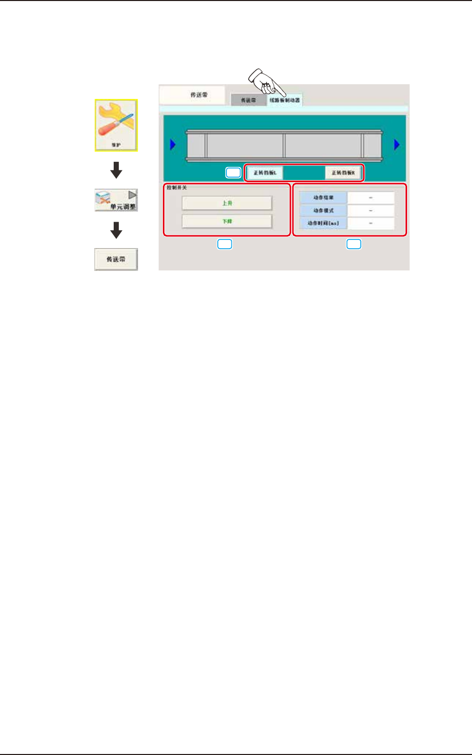 193-3100 CUKYX 4.3 传送带 1-22 4.3.2 线路板制动器 在“线路板制动器”页面中对各线路板制动器进行调整。 界面展开 [1] [2] [3] F3120-CUKYX-00 [1] 线路板制动器选择按钮 选择需要操作的线路板制动器 ( 挡板 )。 [2] 控制开关 [上 升]按 钮 按此按钮,并在 10 秒钟之内按操作台的 [START] 按钮,选定的线路板 制动器上升。 [下 降]按 钮 按此按钮,并在 10 …
