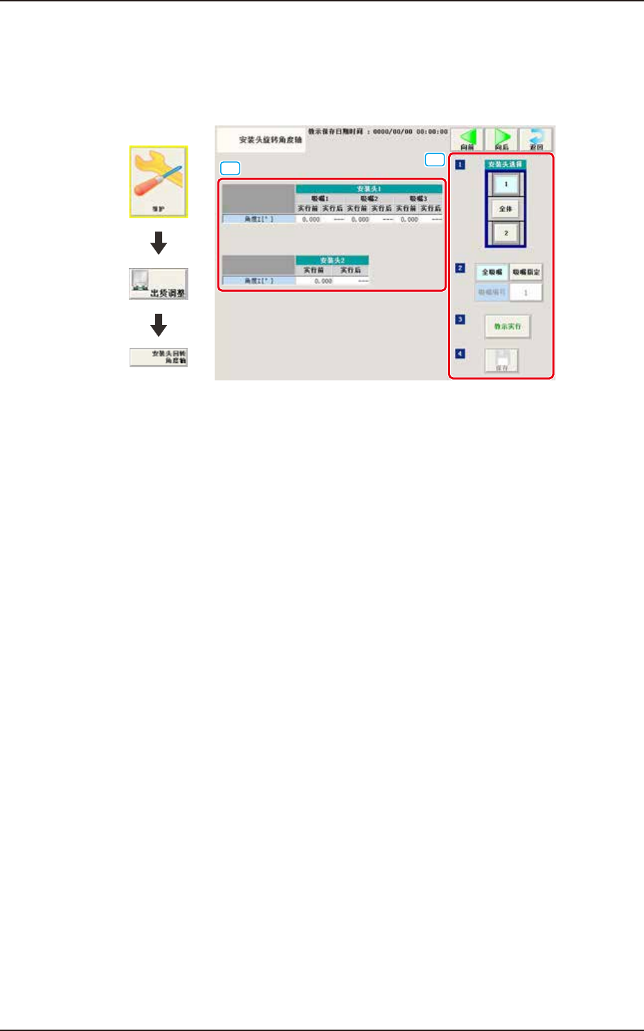 193-3100 CUKYX 5.10 安装头旋转角度轴 1-47 5.10 安装头旋转角度轴 在“安装头旋转角度轴”界面进行的教示结果,用于安装头向相机移动时的 补正中。 界面展开 [1] [2] F3136-CUKYX-00 [1] 教示数据显示部 显示指定的相机的各项补正值数据。 [2] 教示步骤显示部 按操作顺序排列有教示用的按钮。 安装头选择 从安装头 [1]、[2]、[ 全体 ] 按钮中选择进行教示用的安装头。 [ 全吸嘴 …