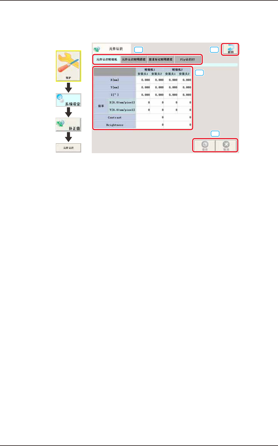 193-3100 CUKYX 2.9 元件识别 2-54 2.9.1 元件识别相机 在 “元件认识 ( 识别 )” 界面中选择 “元件认识照相机” 选项卡, 显示如下页面。 界面展开 [1] [2] [3] [4] F3262-CUKYX-00 [1] X( 横 )、Y( 纵 )[mm] 调整装置基准坐标系原点到元件识别相机中心相对于设计尺寸的位置 偏移。 Xm(+) Ym (+) Xm-Ym : 装置基准坐标系 Xc-Yc : 元件识…