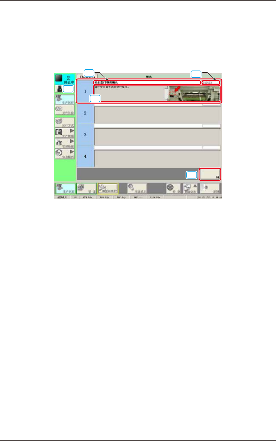 193-41 10 CUKYX 2.1 关于“警告”界面 2-3 • 从警告界面的修复的方法 (1) 记录警告内容。 注 意 为防止因忘记警告内容而无法进行正确地修复,请务必记录警告的内 容。 (2) 按 [OK] 按钮 , 返回到原界面。 (3) 按照警告内容,正确进行修复。