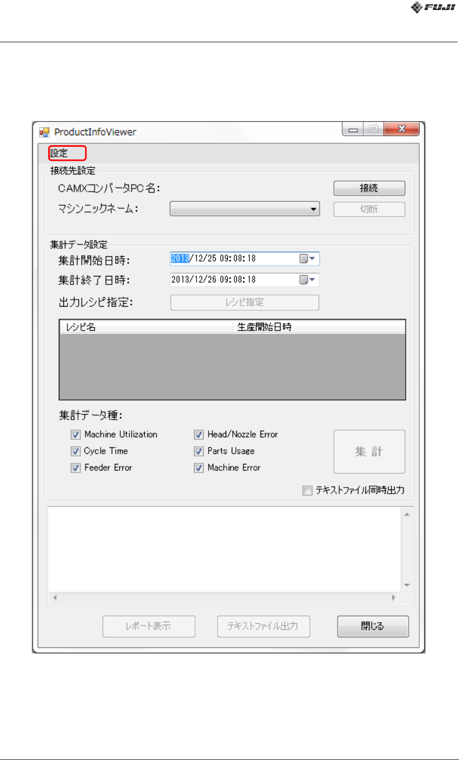 - 7 - USR-SFAV PIV-002S0 【生产信息浏览器主画面的构成 】 No 名称 内容 1 [设置]菜单 显示生产信息浏览器的设置画面 2 [连接]键 用于连接安装了 CAMX Converter 的计算机 3 Machine nickname 请从下拉菜单中选择需要用到的 sFAB 。请在这里选择需要 导数据的机器。 4 [断开]键 用于切断与 CAMX Converte r 的连接 5 数据导出开始时间 用于设置开始导…
