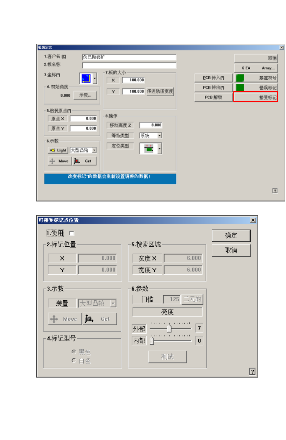Boar d 定义 6-25 显示 Accept Mark 的坐标。 <3. 示教 > 按钮 示教 Accept Mark 偏移。 <4. Mark 点类型 > 领域 选择可接受基准点的颜色。可选 择的可接受基准点的颜色如下。 黑色 : 标记 比周边暗的情况。 白色 : 标记 比周边亮的情况。 <5. 相机号 .> 组合框 选择检查 Accept Mark 的 Camera 。 现…