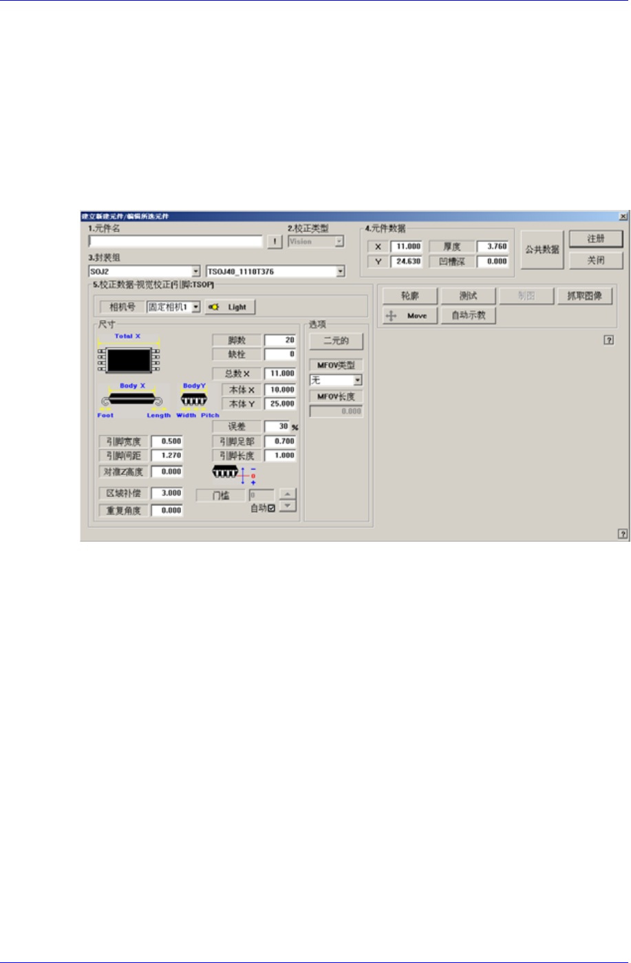 Samsung Component Placer SM320 Administrator ’ s Guide 设定部品身的 X 轴方向的尺寸。 < 本体 Y> 编辑框 设定部品身的 Y 轴方向的尺寸。 <T olerance> 编辑框 输入部件数据的余量。基本值为 30% 。 < 引脚宽 度 > 编辑框 设定引线的宽度。 < 引脚间 距 > 编辑框 设定引脚之间的间距。 …