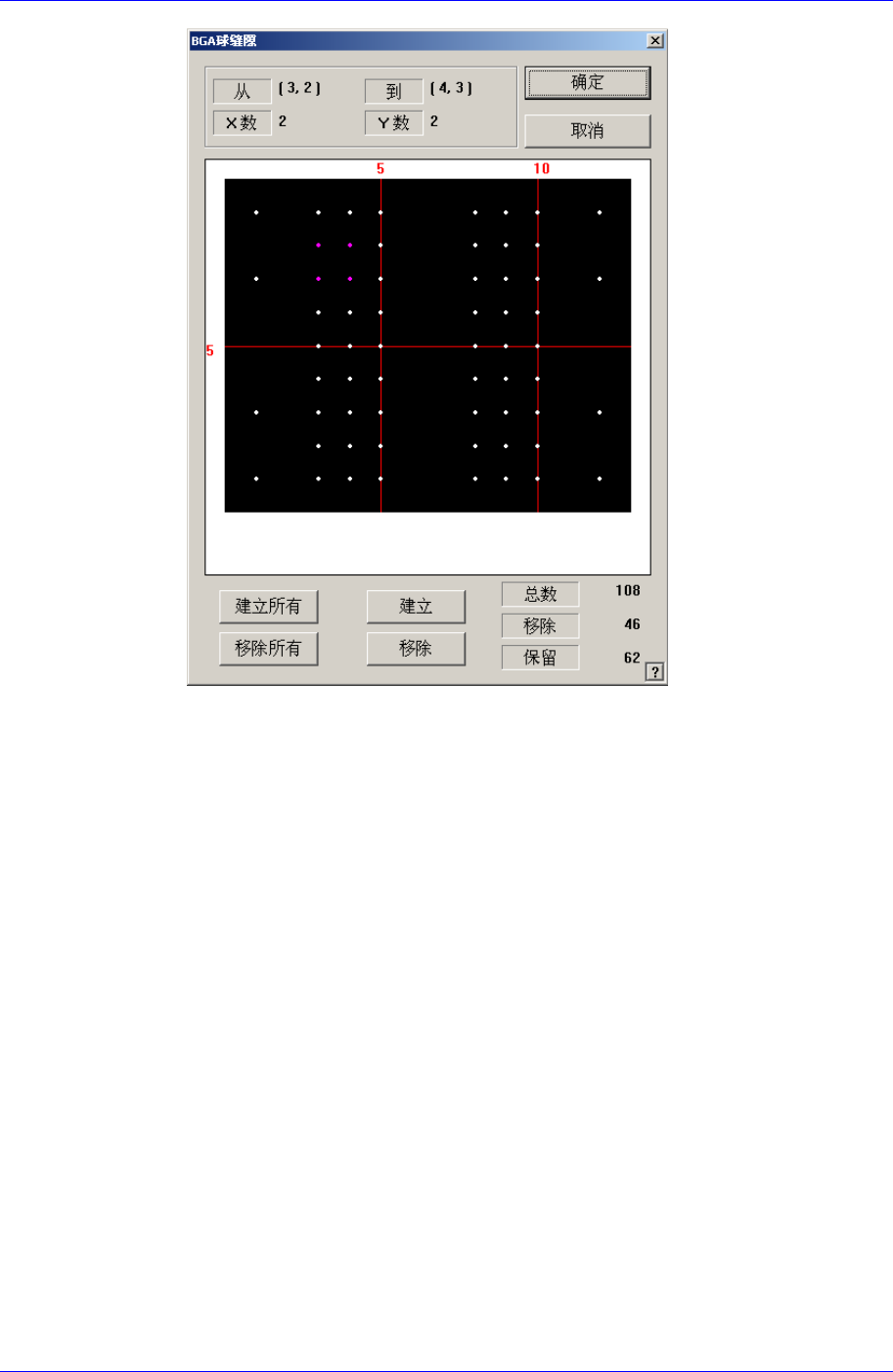 元件的登记 7-51 图 7-29. BGA 元件的球空开 - 已删除选择领域的球形的 状态 ” 对话框 ype “ 的 pe> 。 m> 按钮 部设定对话 。一般部 定 < 确定 > 按钮 储存已设定的球空开的当前状态 之后关闭对话框。 < 取消 > 按钮 忽略已设定的球空开的当前状态 直接关闭对话框。 <MFOV T > 组合框 设定分割识别 Type 。详细事项请参照 “…