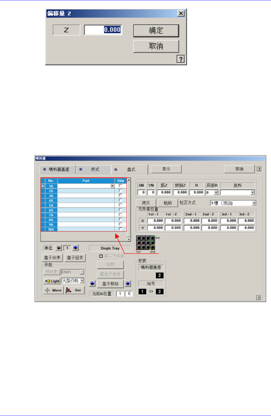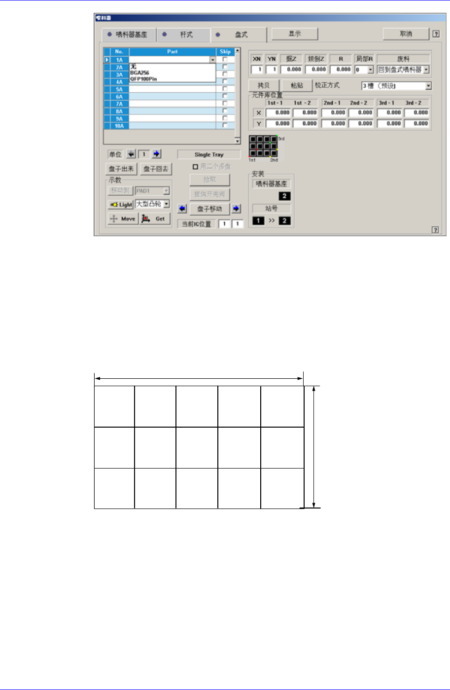 供应装置的设置 8-15 <SK> 列 相应的 Tray 已设置 Tray Feeder 时 ,选择从 Tr ay Feeder 供给的部件吸附与 <XN > 编辑框 X 轴方向的数量。 <YN > 编辑框 设定排列在多盘式上的部品的 Y 轴方向的数量。 否。 设定排列在多盘式上的部品的 应设定为多盘式 ) <R> 列 该多盘式 XN=5 YN=3 <PickZ&…