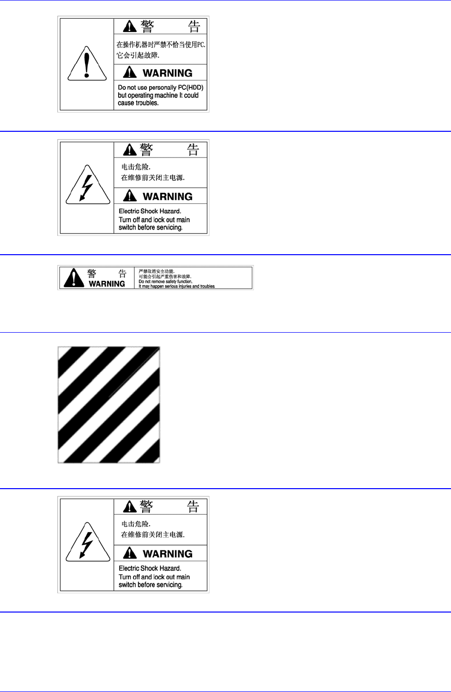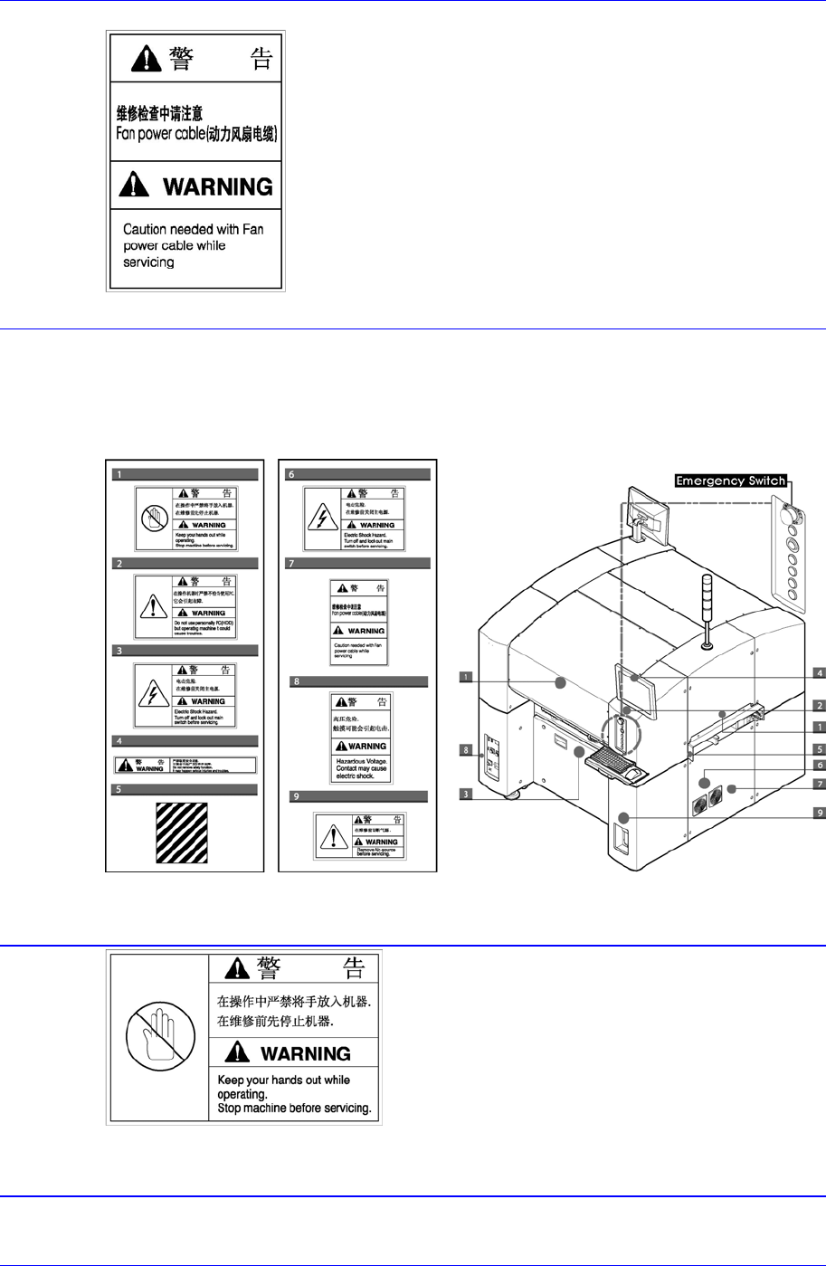 Samsung Component Placer SM320 Administrator ’ s Guide 设备运行中不可以因私人目的使用计算 机。 可能会发生设备运行问题 盖子内侧及周围连接物部位存 在高电压 要注意电击危险。 在维护和修理设备操作时一定 要先切断 主电源。 请不要移掉安全装置,否则可能导致 严重的 伤亡事故。 注意:安全色和对比色 黄色和黑色组合被指定为临时或永久的危 险场所,存在移动体 (Conveyor) 。 …