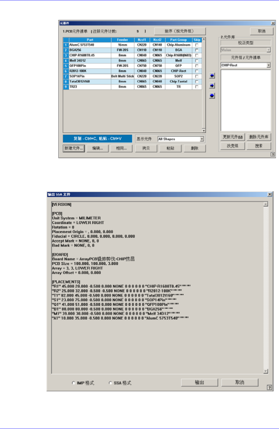 Samsung Component Placer SM320 Administrator ’ s Guide 未登记的 一切元件的信息被登记后 将如下。 <Export…> 按钮 它执行把在本设备编辑的步骤数 据转换成其它形式 (SSA Format) 的 ASCII 文件的 功能。单击此按钮时显示如下的 对话框。 9-12
