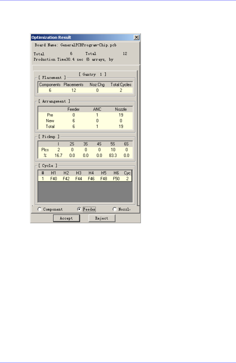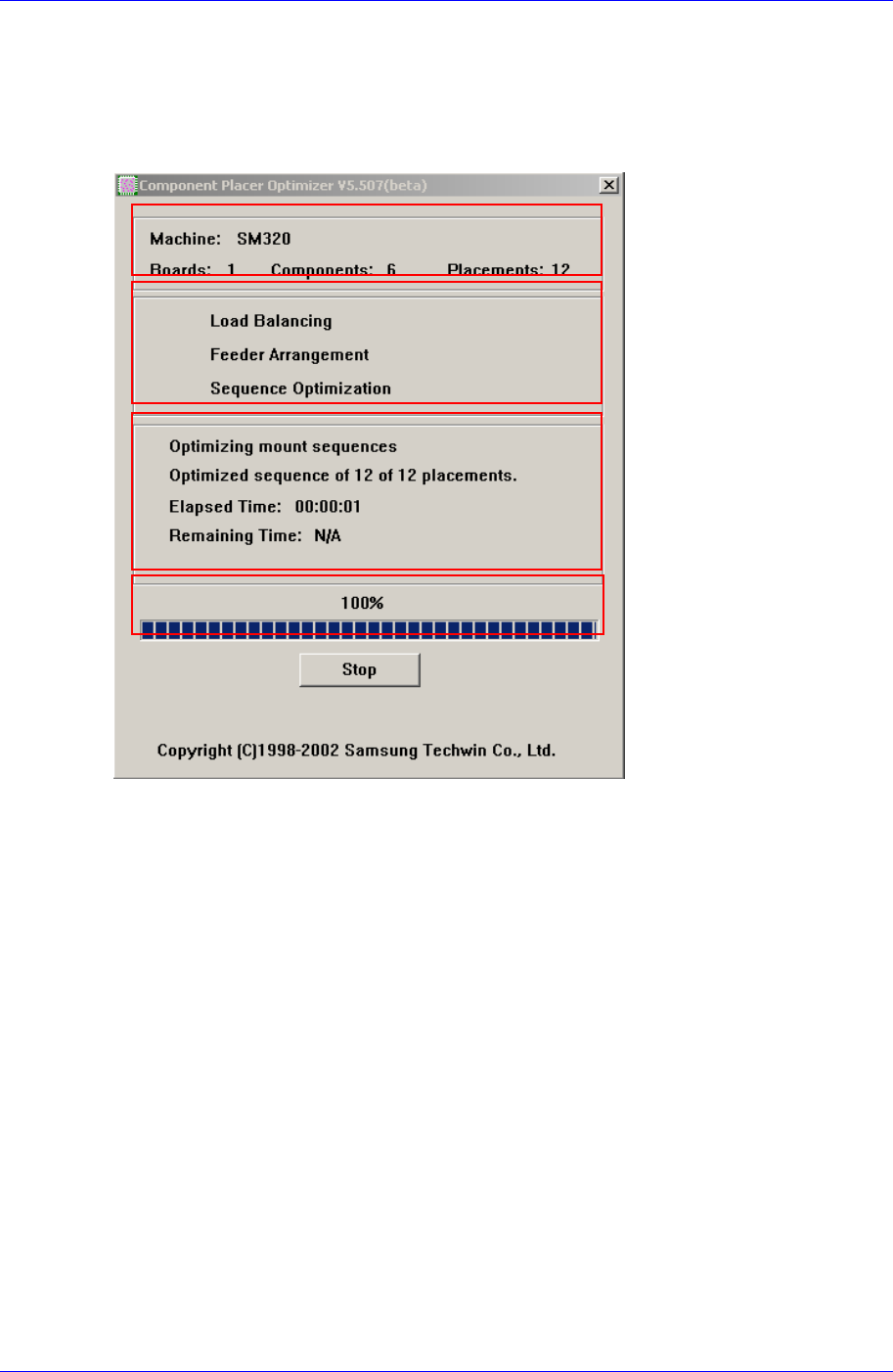 Optimization 10-9 10.6. Optimizer Dialog < 运行优化 > 按钮时执行优化,执 行中会出现下面的对话框 。 按 图 10-7. " 优化 " 对话框 第一部分显示的是设备型号,部品种类数及总装 帖点数。第二部分通过检查标记显 优化的进行阶段,显示的检查标记即目前进行的阶段。第 三部分显示更详细的进 优化的进行时间 (Elapsed T i me), 剩余时 间 (R…