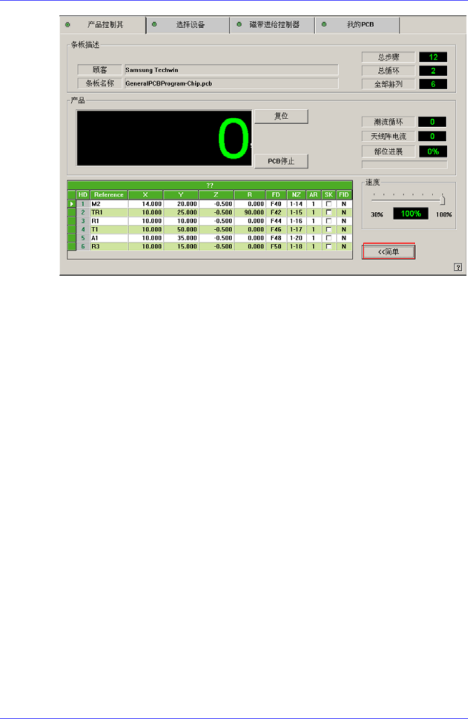 Samsung Component Placer SM320 Administrator ’ s Guide 作业中选择此功能,则完成当前贴装领域内的 PCB 贴装作业后,暂停设备 。 <Place Progr ess> 静态框 显示贴装作业过程的同时以百分 比表示进行状况。 <Current Cy cle> 静态框 显示当前贴装作业中的循环周期 。 <Current Arr ay> 静态…