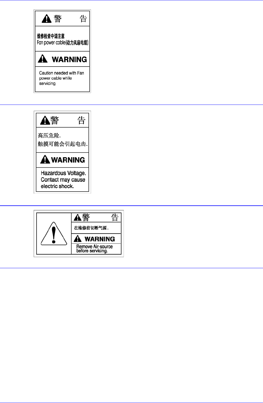 Samsung Component Placer SM320 Administrator ’ s Guide 设备内部 设备内部贴有以下标签 图 0-3. 设备内部的安全 标签 的严重损伤。 设备维护及修理前必须注意切断 电 有残余电流,否 请不要拆卸设备头,否则可能产生设 备头部分 注意触电危险(禁止接触) 源以防 则会有致命危险。 viii