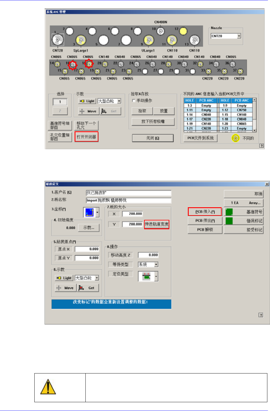Placement T est 13-3 3. 单击 <PCB->System> 按钮, 比较实际设备的吸嘴设置与 PCB 文件的吸嘴设 置,以手动方式修正并使它们一 致 。 4. 根据贴装试验的基板宽度调节输送 带宽度。 5. 检查和 MoveZ 及 A 6. 然后把放置拟试验的 PCB ,使位于输送带入口的检测传感 器能识别它,然后单 击 <PC B In> 键使拟试验的 PCB 固定在输送带工作区域。…