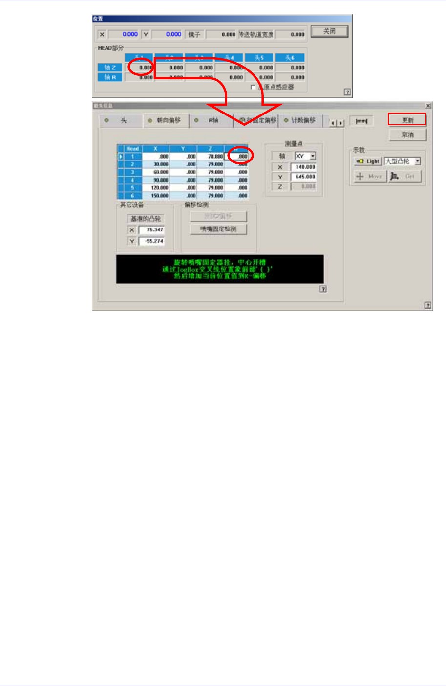 Machine Calibration 7. 同样地测定 Head 2 ~ Head 6 。 <Update> 按钮 向设备传送变更事项后关闭对话 框。 <Cancel> 按钮 忽略变更事项关闭对话框。 14.1.3. <R Axis> T AP 对话框 显示各磁头的 R 轴补偿 值,或设置 R 轴的补偿 与否。 Camera Calibration 过程中执行 R-Axis Offset C…