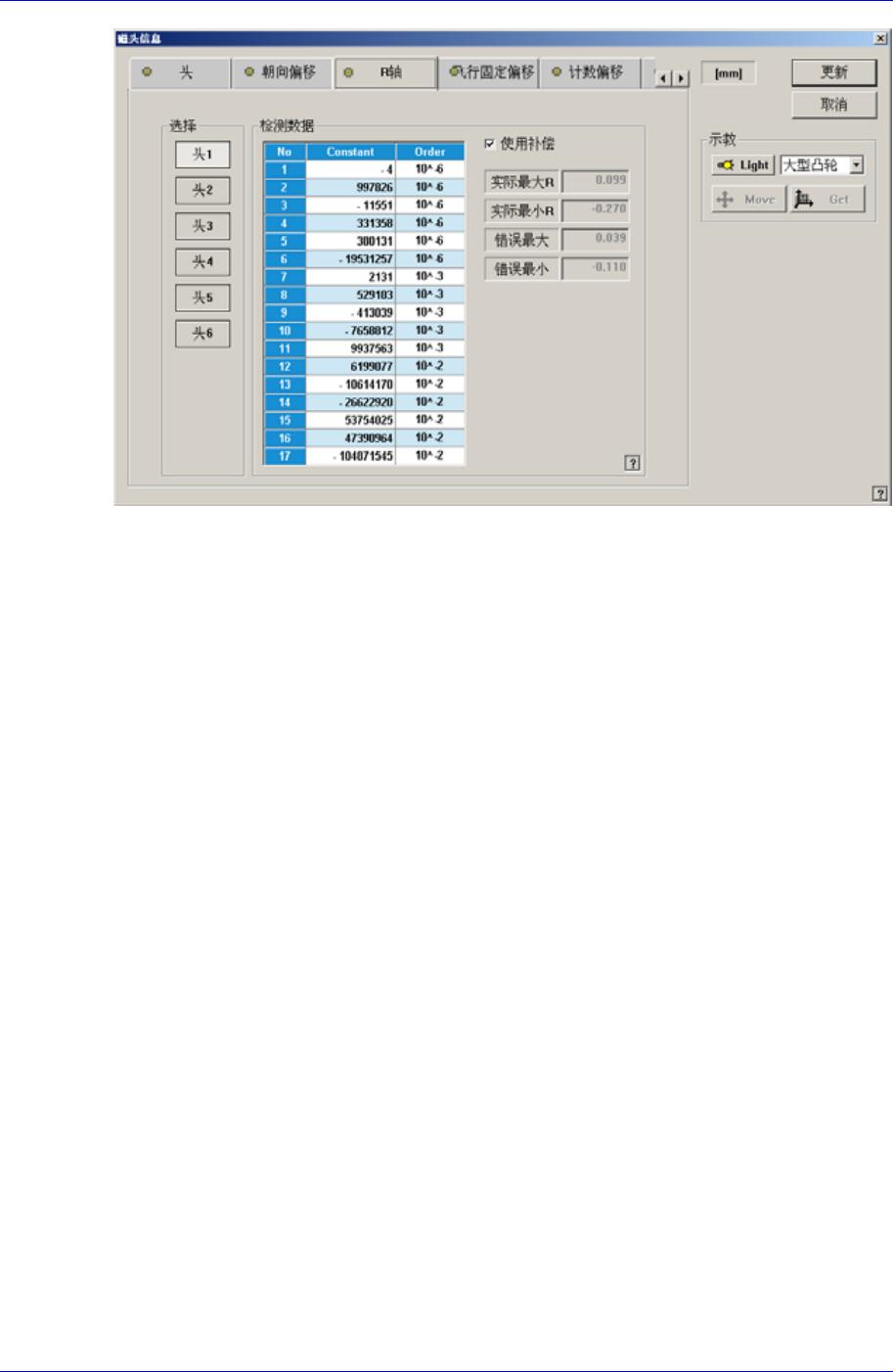 显示各磁头的R轴补偿值,或设置R轴的补偿与否。 Camera Calibration过程中执行