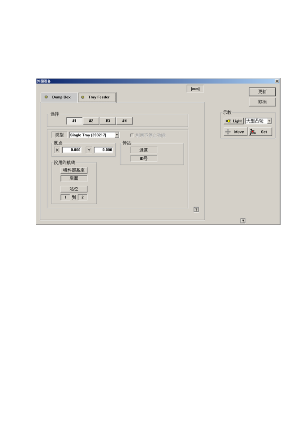 系统设置 15-1 1 设定 Non-Stop 功能的使用与否。 < 原点 > 领域 设定已选择的盘式喂料器单位的原点。此原点为从设备的 原点计算的偏移量。 如下图设置左侧或右侧的点: T ray Feeder 的 Origin 设置方法如下 : 1. 如果安装了 Auto T ray 后没有设置 Origin ,现有程序上的 Tra y 坐标值将在清 除 Tr a y 后插入时起变化,因此需 要进行示教。 如果在第一次…