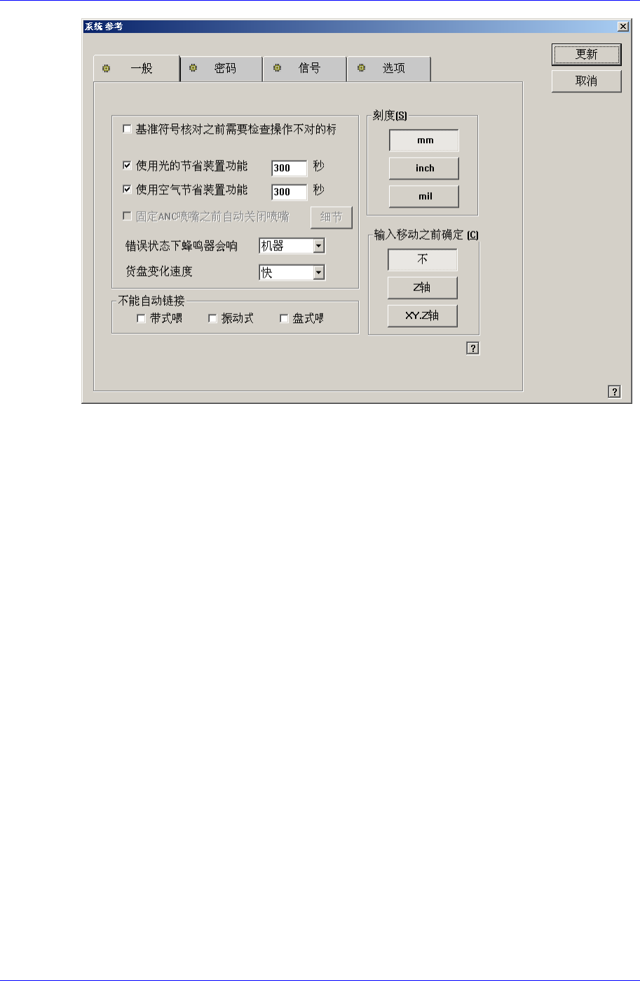系统设置 15-13 图 15-8. “ Syst em Pr efer ence ” 对话框中 “ General ’ TA P 对话框 < 坏标志检测输入基准点 检测之前 > 检查框 检查此按钮时:安装好 PCB 时,进行基准点标 记的检查之前先进行坏的基准点 的检查。 在多重 Array PCB 时先识别 Bad Mark ,忽略不需要检查的 PCB 的 Fiducial Mark 检查作业。 如果 PCB 固定在…
