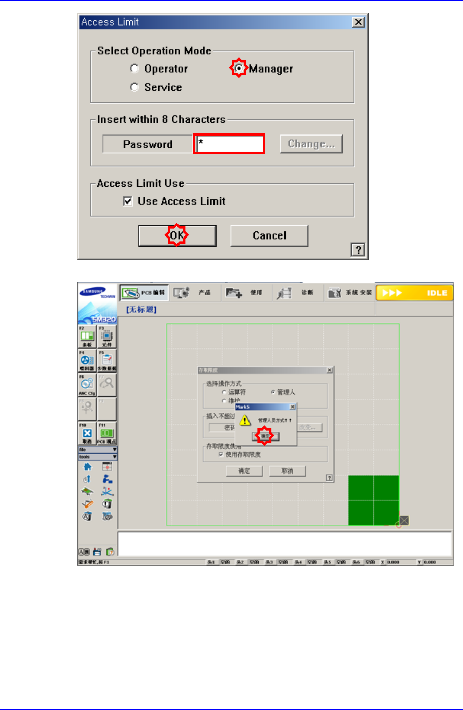 Samsung Component Placer SM320 Administrator ’ s Guide <Select Oper ation Mode> 领域 选择设备的启动 Mode 。 <Operator> 选项按钮 为操作人员设置密码。( 异常状态,错误修复,程序画 面的构成,设备 的启动及终止, PCB 生产准备,开始生产,设备停止,结束生产,作 业整理及清扫等等) <Manage…
