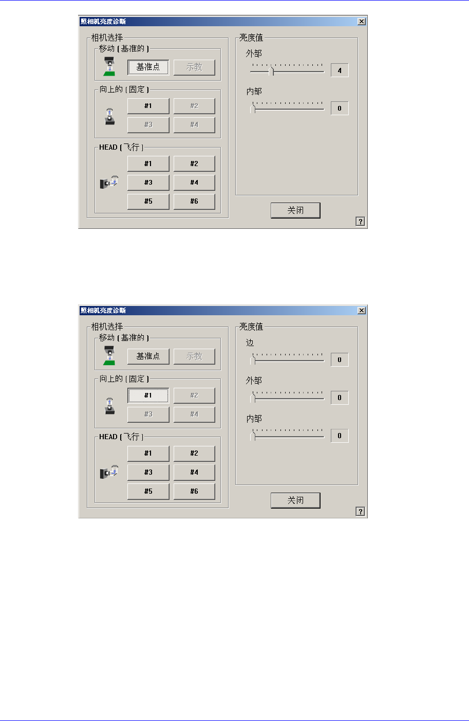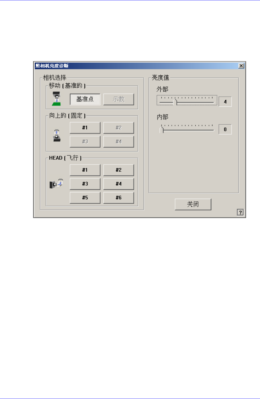 Diagnosis 16-5 16.3. 灯光( Light ) [F4] 检查安装在移动照相机 , 飞行照相机固定照相 机的照明装置。 单击此按钮时显示如下的对话框 。 图 16-5. “ 诊断 : 照相机亮度诊断 ” 初始画面 < 相机选择 > 领域 选择装有将要检查的照明装置的 摄象机。 < 基准的 > 照相机 选择头部上的移动照相 机。移动照相机又称 Teach Camera , Fiducial…