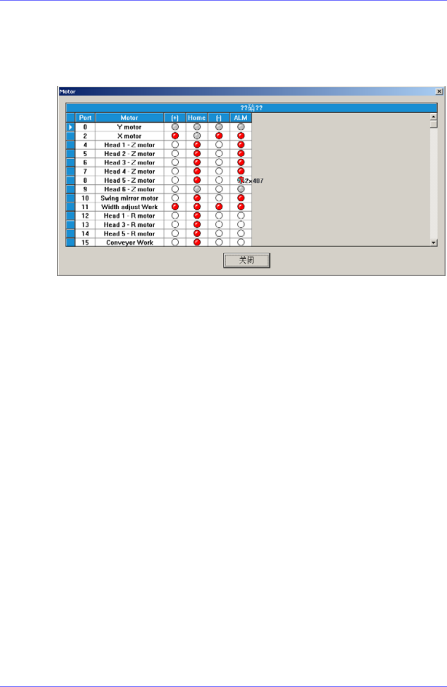 Samsung Component Placer SM320 Administrator ’ Guide 16-12 16.7. Motor I/O [F9] 显示与驱动电动机有关的传感器 输入状态。 图 16-12. “ Diagnosis :Mot or ” 对话框