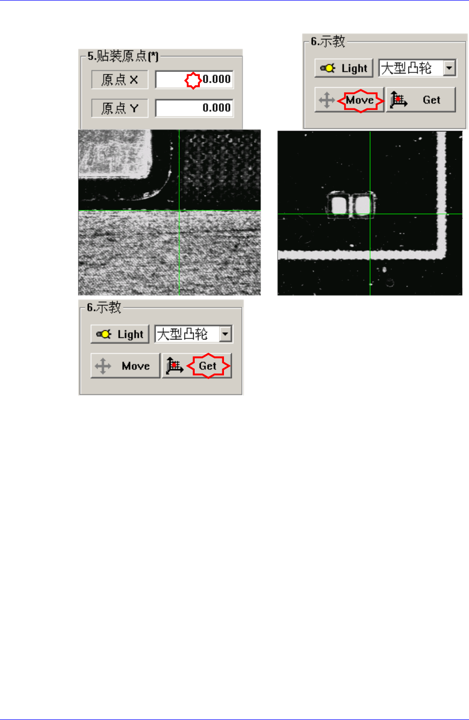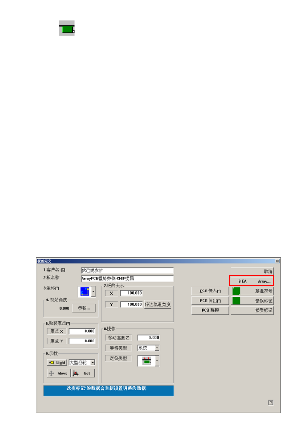 Boar d 定义 6-5 头 5: 指定 5 号头。 头 6: 指定 6 号头。 < > <Device> 组合框中选择的对 定的坐标位置。此时,在点击 <Mo 以 <Device> 组合框中选择的对象为基准获 取 XY, Z 轴坐标。此时,在点击 <Get> 按钮之前应该 用鼠标点击跟坐标有关的对象 (Place Origin, MoveZ) 。 <7. 板的大小 &g…