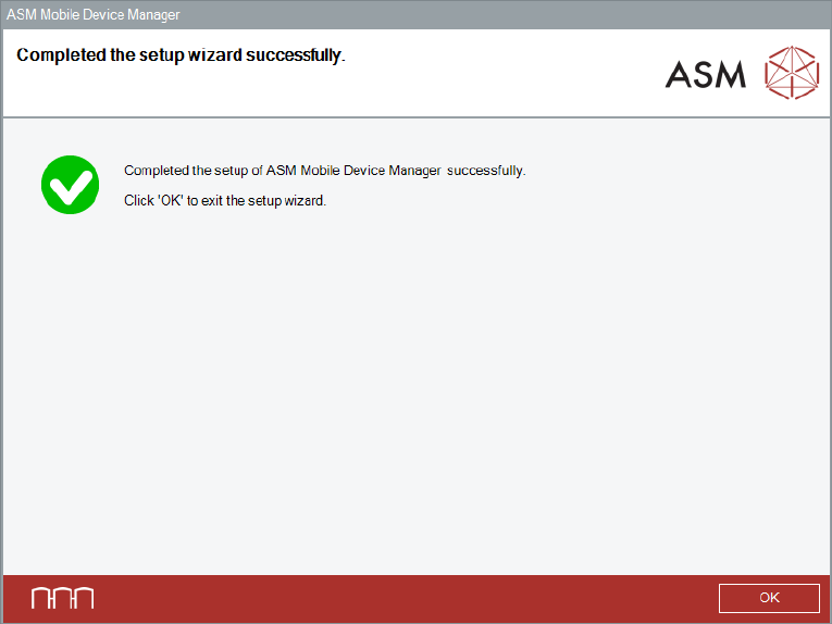 ASM Mobile Device Manager 1.1 / Insta llation Manual 05/2019 Edition 17 After successf ul installation, the following d ialog is displa yed. Figure 5-8: Setup successfull y com pleted dialog ► Click the OK butto n to exi…