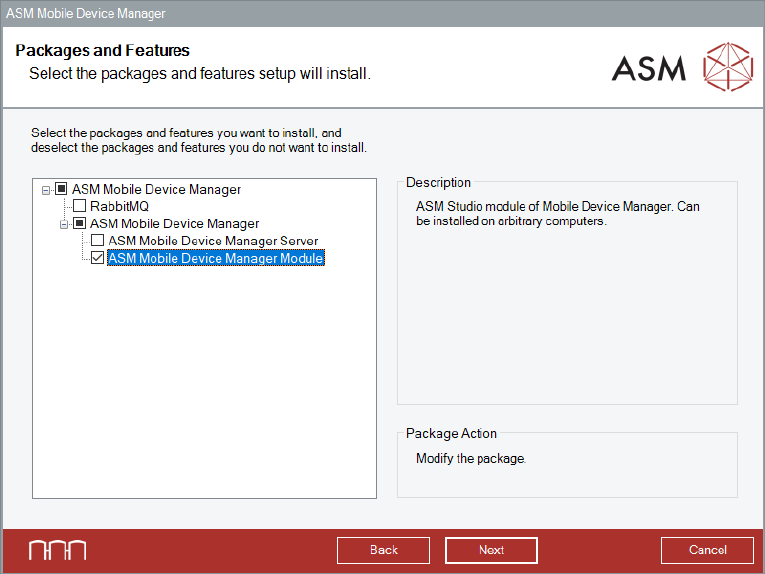 ► Start installing ASM Mobile Device Manager as described in section 5.2.