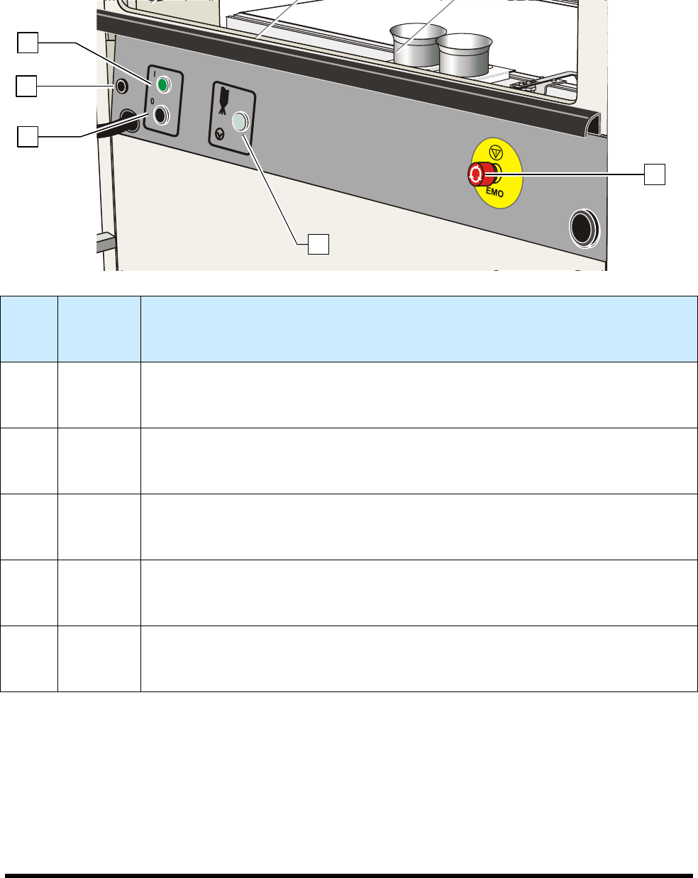 6 介绍 1.10.1.1 控制面板 以下内容详细介绍了 SL - 940E/SL - 941E 控制面板的各按钮功能 , 如图 1-2 . 所示。 编号 名称 描述 1 启动按钮 位于控制面板上的 启动按钮 为按压式按钮。他可以启动整个涂敷 系统。当 启动按钮 被按 下时,按钮会亮起绿灯,并且绿灯会 一直亮下去,直到 按下 停止按钮 或 紧急制动按钮 (EMO) 。 2 静电腕带 连接口 操作人员或者技术人员通常会把静电 腕带连接在此…