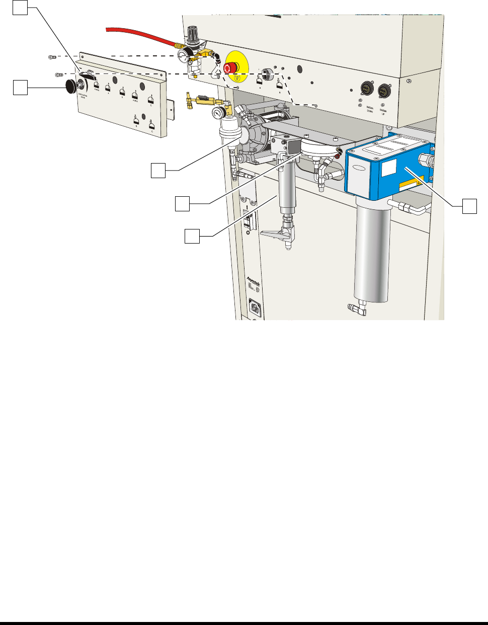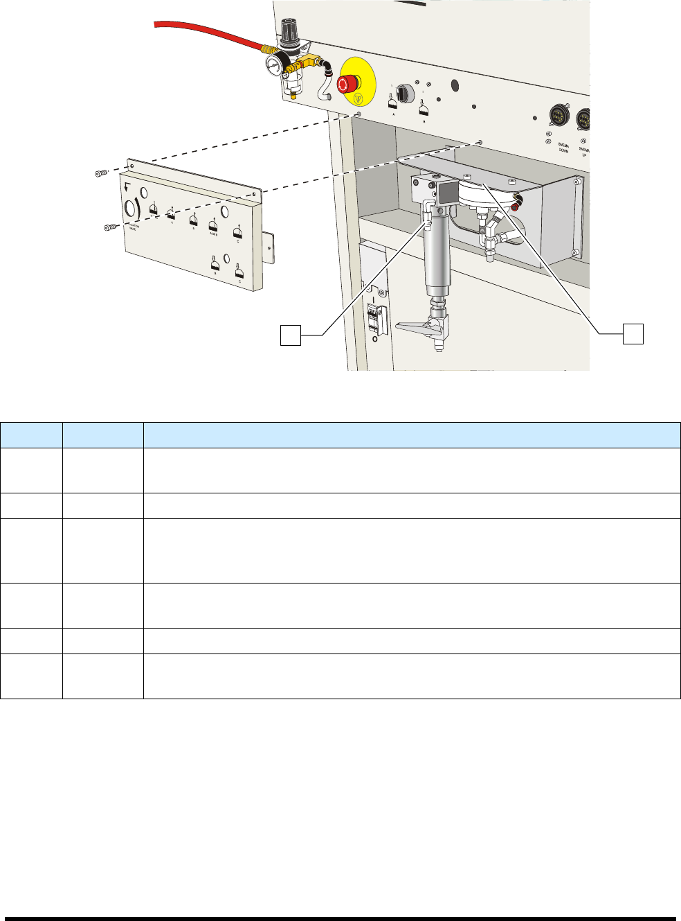 介绍 13 图 1-7 B 非循环式流体系统 编号 名称 描述 1 冲洗阀 冲洗阀主要用于排空循环式胶水供应 系统内的空气。阀体净化操 作跳过环流阀作业, 通常在系统作业启动前 或更换 胶水后使用。 2 环流阀 环流阀用来控制流通环路的流量。 3 泵 该隔膜泵为气动的往复泵,在 100 psi 下进行 1:1 的工作。 作用 于该泵上的压力,由 SL - 940E/SL - 941E 表面涂敷系统的主气压直接供应。 4 胶水调节 阀 该…