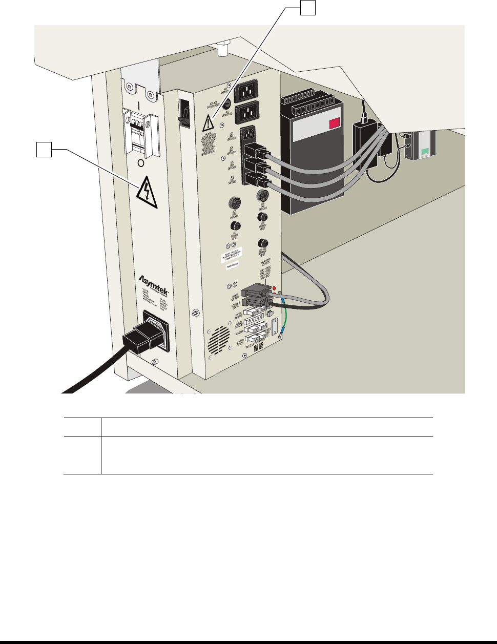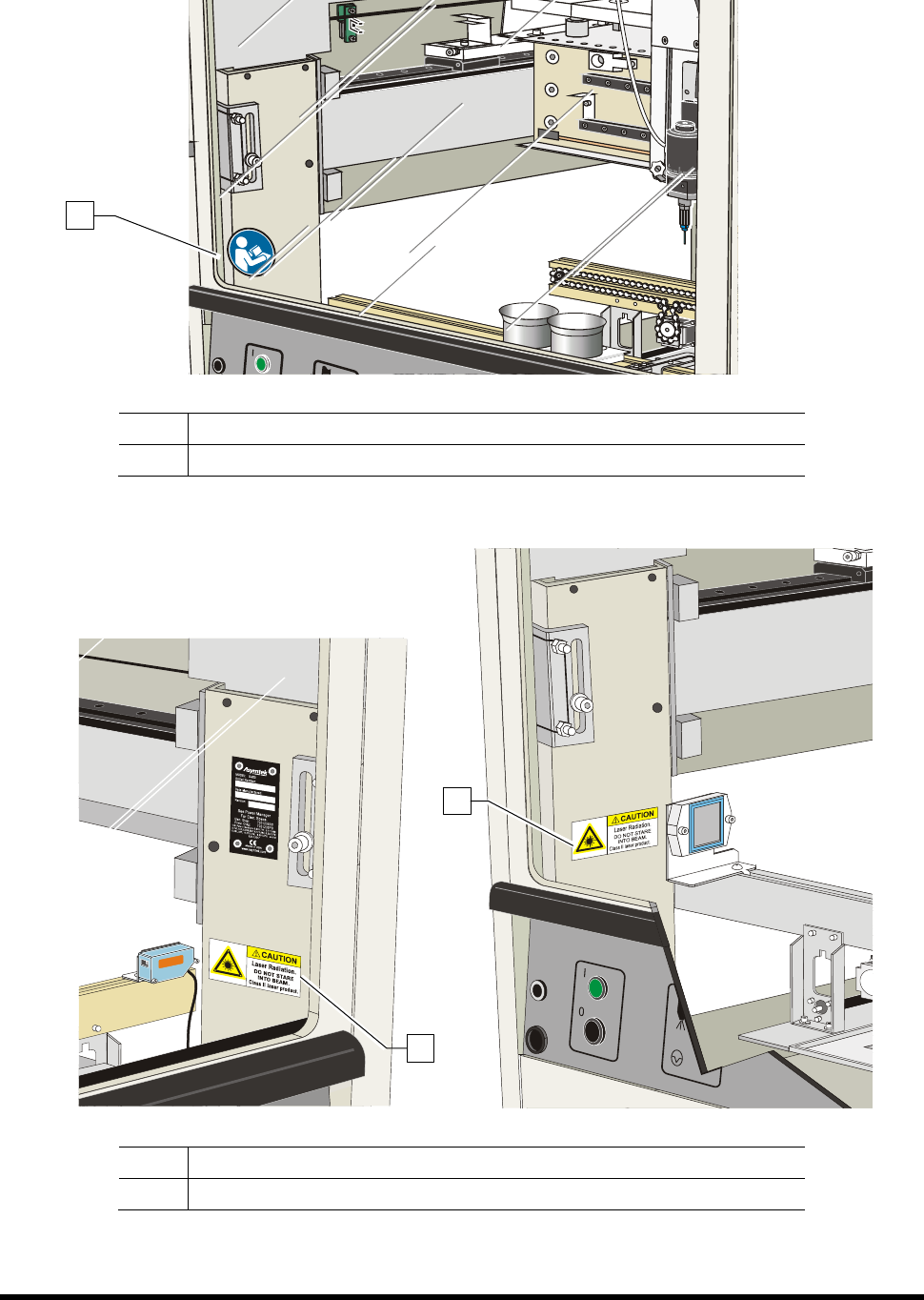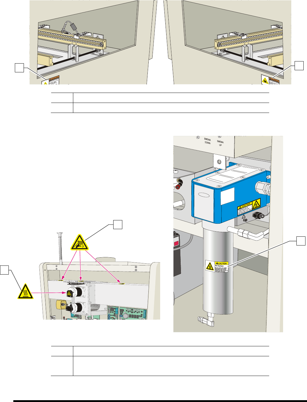 22 安全 编号 描述 1 运动零部 件标识 图 2-3 安全警示标示 – 传送带 编号 描述 1 手被卷缠标识 2 热表面标识 图 2-4 安全警示标识 – 后视图 1 1 1 2 2