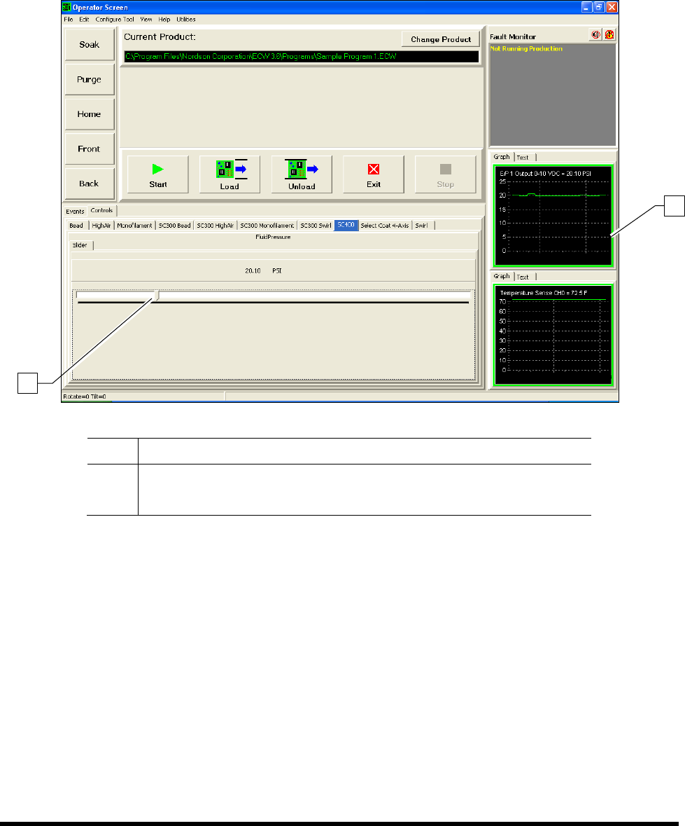 42 操作 如何监控 胶水 压力: ECXP 的操作界面可以显示流体压力的实 时状况,操作者在生产过程 中可以方便阅读到这些数据 。通过点击、 选用相应的功能,这些压力数据可以 生成为图片或者文本格式 ( 图 3- 10 ) 。可以直接在操作界面内进行胶水 压力 调节。 编号 描述 1 胶水压力实时监控 2 胶水 压力调节杆 图 3- 10 ECXP 软件监控 胶水 压力 2 1