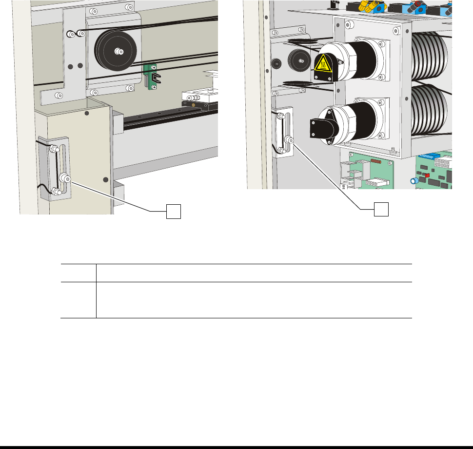 维护 75 4.11.2 手动紧固钢丝操作规程 手动紧拉钢索 : 1. 维护停机,详情参阅 2.12 维护关机 。 2. 将位于涂敷系统后端的储液装置气压 开关旋转至 OFF 位置,为流体系统减压。 3. 松开 X- 轴 和 (2) Y - 轴 钢索紧拉螺丝。 4. 推着 机器手 在涂敷区域内的最大长度和宽度范围内移动 大约 5 次。 5. 最终在涂敷区域的中心位置。 6. 重新拧紧钢索紧拉螺丝。 图 4- 11 A 紧拉 X- 轴 钢…