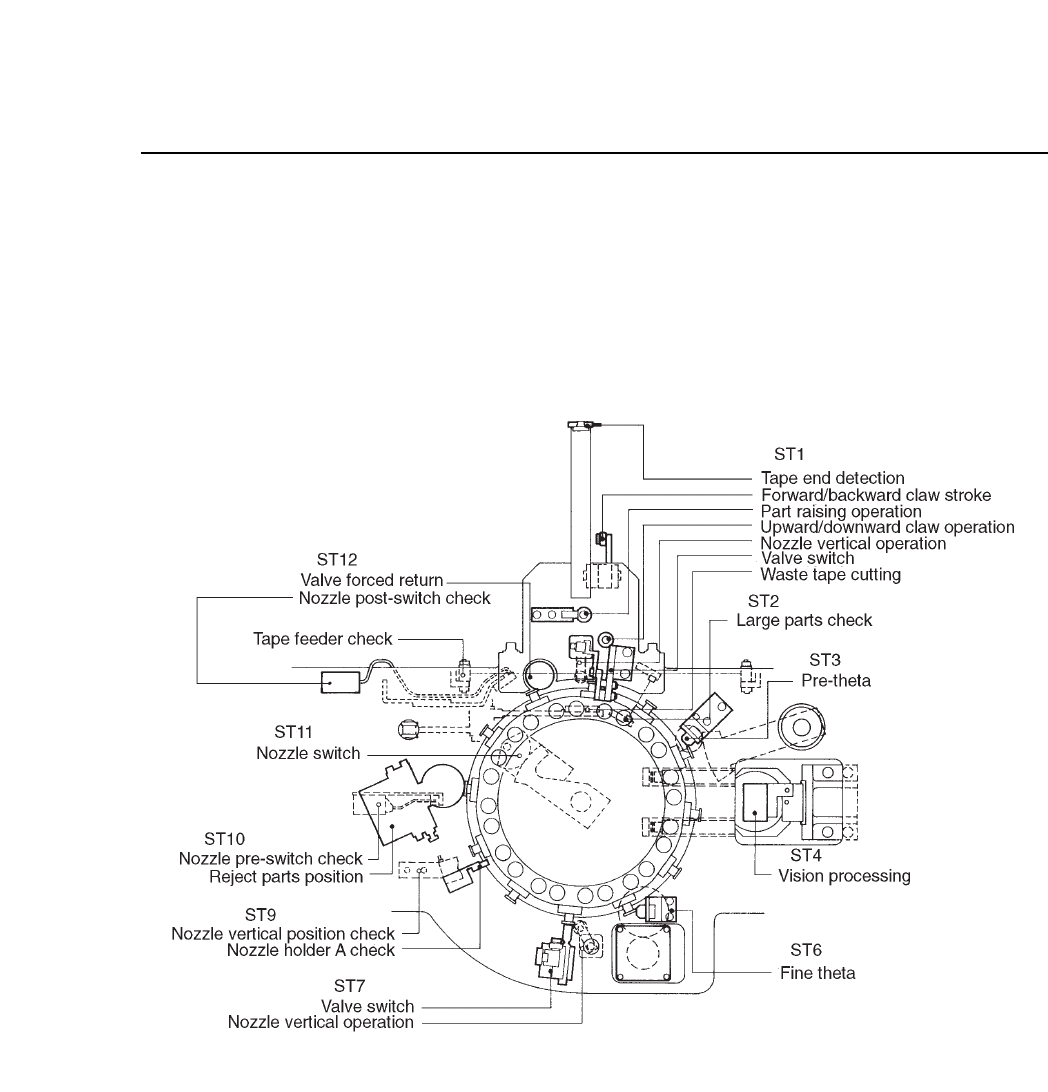 Chapter 5 The T welve Stations 5.1 Station 1 The nozzle at Station 1 picks up parts from the tape set in the feeder . The feeders, nozzles, and the twelve heads all combine to make pick-up possible with the following ope…