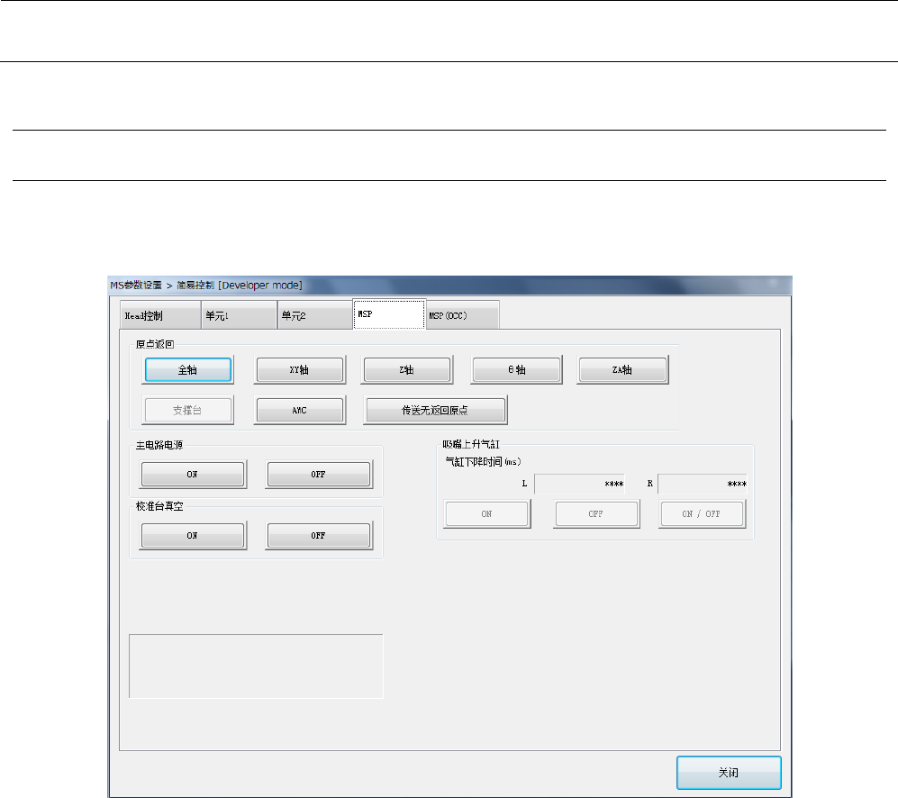 MS 参数 简易控制 10 10 -1 MSP 选项卡 可进行指定设备的原 点返回、主电路电 源(伺服)的 ON/OFF 、校 准台真空 ON/OFF 、吸嘴上 升气缸控 制、 VCS 气缸控制、 VCS 照明高度控制 。 10 -1