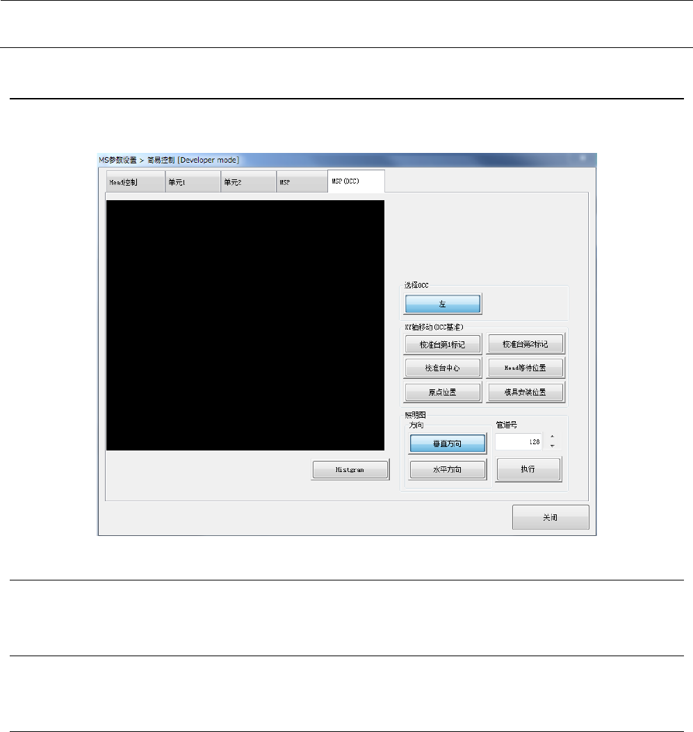 MS 参数 10 -2 简易控制 - MS P ( OCC ) 对以 OCC 基准移动 的移动按钮、照明 图、 H i st og r am (直方图) 可进行控制。 10 -2-1 OCC 选择 选择作为基准的 OCC 。将只显示“左 ” 10 -2-2 XY 轴移动( OC C 基准) 点击各位置的自动复 位按钮后, OCC 的中心即移动到 该位置。 10 -2-3 照明图 请输入方向、管道号 后点击“执行”按 钮。 取得所指定位置…