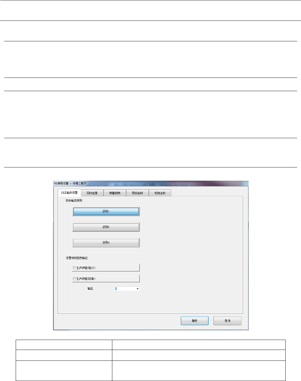 MS 参数 3-5 特订 根据需要进行设置。 通常情况下不需要 设置。 3-6 服务人员 3-6- 1 功能 设置修理工序师要用 的、与各种生产等 动作或日志相 关的规格。 本项目分为 “日志输出设 置” 、 “实时检 查” 、 “质 量预防” 、 “带状 送料” 和“ 吸取送料” , 可利用 选项卡进行切换。 3-6- 2 操作 从菜单中选择“初始 设置” - “服务 人员”后,会显示 如下的对话框。 3-6- 2 -1 日志输出设置…