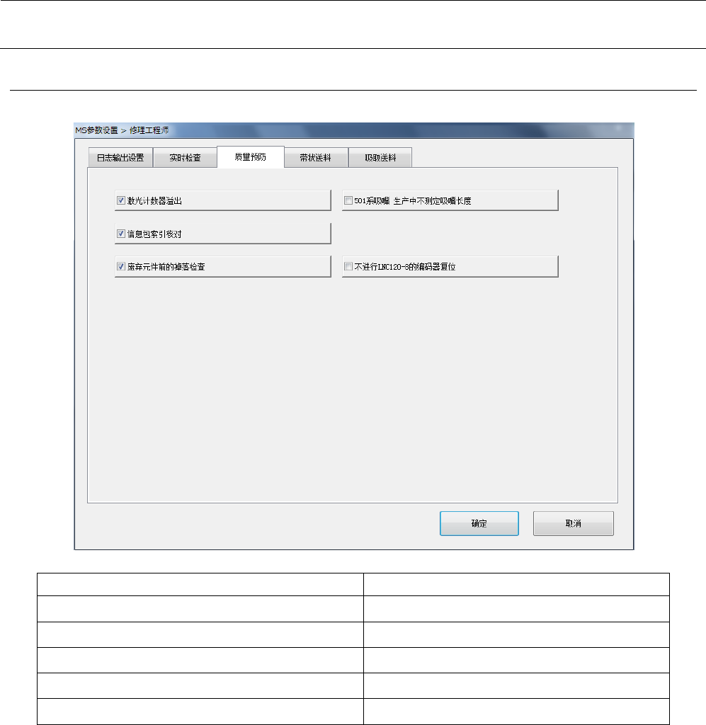 MS 参数 3-6- 2 -3 质量预防 点击选项卡“质量预 防”后,会显示以 下的画面。 设置项目 说明 激光计数器溢出 设置使用/未使用 信息包索引核对 设置使用/未使用 废弃元件前的掉 落检查 设置使用/未使用 501 吸嘴 生产中不测定吸嘴长度 设置使用/未使用 不进行 LNC 120 -8 的编码器 复位 设置使用/未使用 3- 17