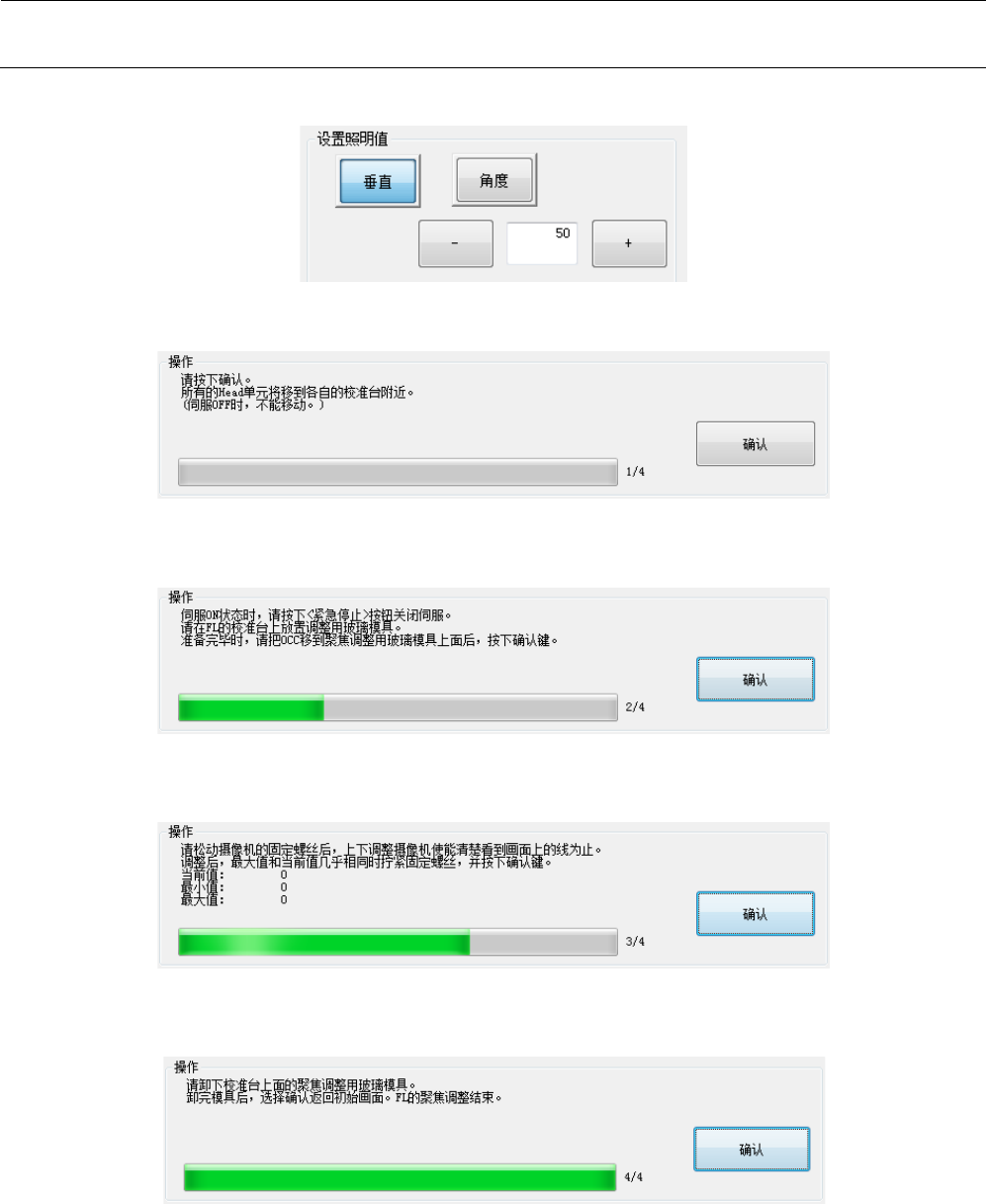 MS 参数 在“设置照明值”项 目中对角度照明及 垂直照明的光 量进行调整。 <操作 ・ 1/4 > 设备选择、照明值的 设置结束后,按下 “操作”框内 的“确认”按钮。 选择“确认”按钮后 ,以 OCC 基准移动到校 准台上。 <操作 ・ 2/4 > 设备移动到校准台附 近时,将显示上述 操作内容。 按紧急停止按钮,使 伺服处于 OF F 状 态后,设置聚 焦模具。 <操作 ・ 3/4 > 松开用于固定 OC C 的螺丝,上 下移动,…